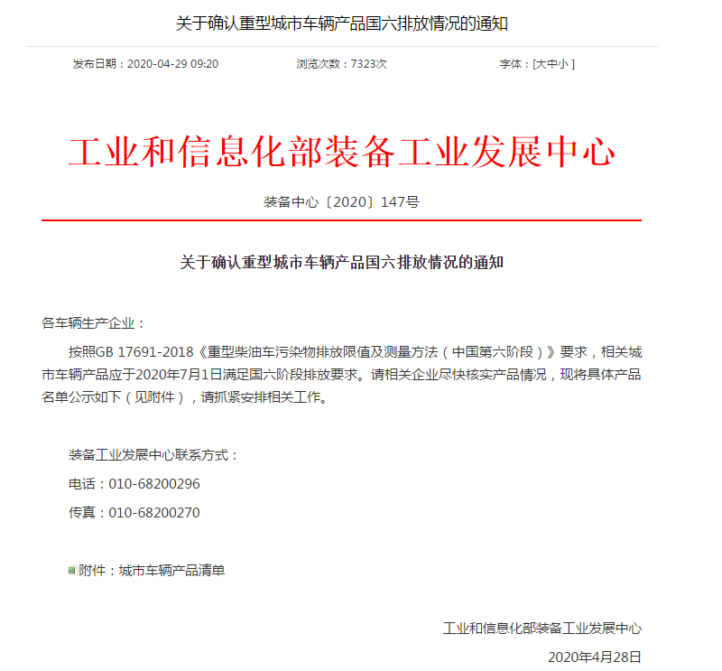 按照GB 17691-2018《重型柴油車污染物排放限值及測量方法(中國第六階段)》要求,相關城市車輛產品應于2020年7月1日滿足國六階段排放要求。請相關企業盡快核實產品情況,現將具體產品名單公示如下(見附件),請抓緊安排相關工作。