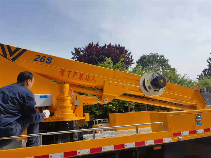 26米高空作業車基本功能安全配置:作業車可以實現平臺載荷230KG,最大作業高度26米,最大作業幅度15米。